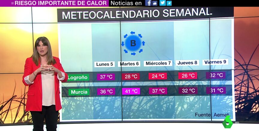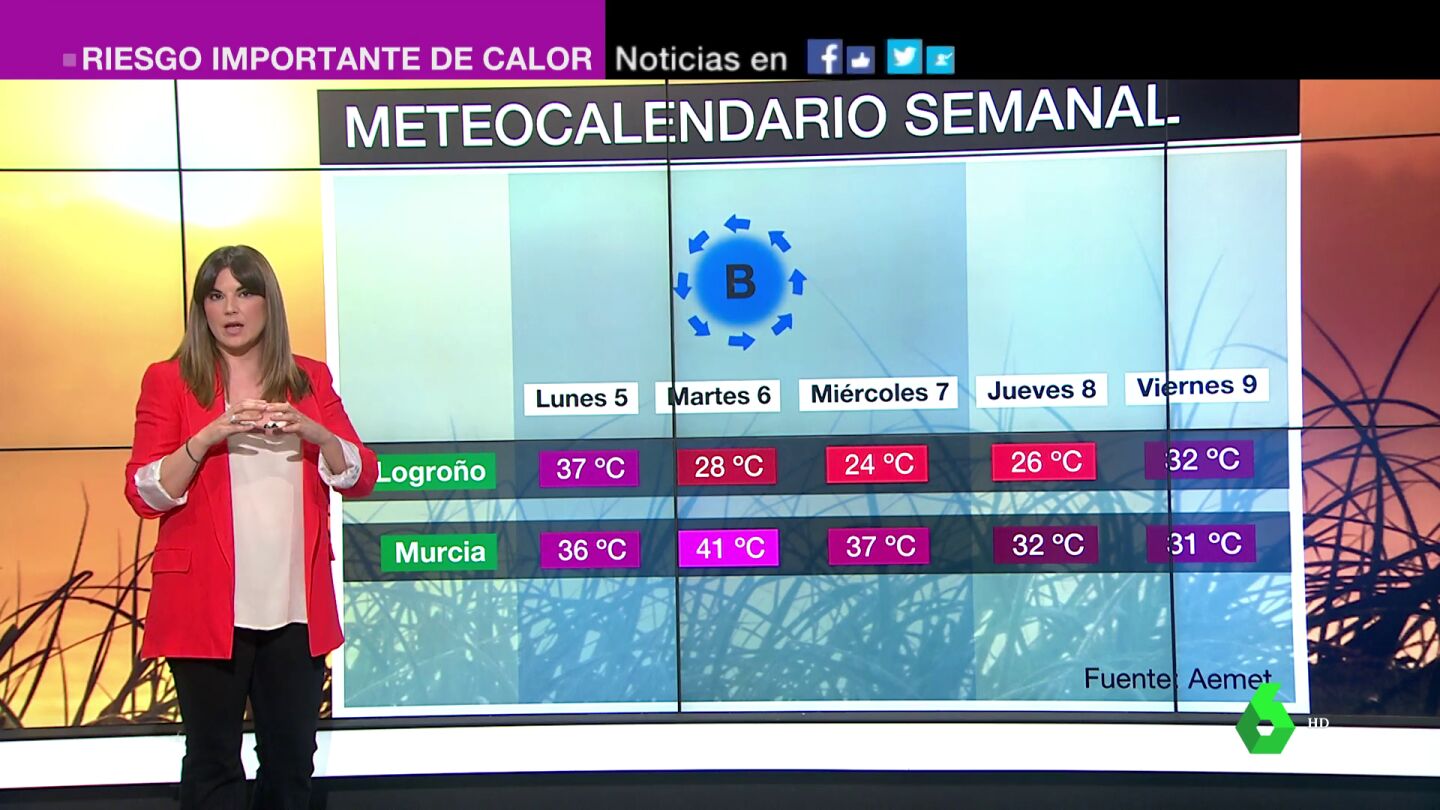 En esas zonas se espera llegar y superar los 40 ºC, pero a partir del lunes, el panorama cambia. Fijándonos en dos capitales de provincia, Logroño y Murcia, para comprobar los efectos que tendrá la entrada de una borrasca, como explicamos en el vídeo.
