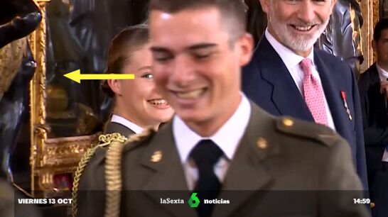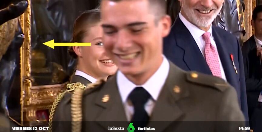 Las sonrisas y miradas cómplices de los reyes Felipe VI y Letizia durante el saludo de la princesa Leonor a dos de sus compañeros de la Academia Militar de Zaragoza durante el besamanos en el Palacio Real dejan una de las escenas más comentadas y virales del 12 de octubre. Pero, ¿a quién miran realmente la princesa y los reyes?