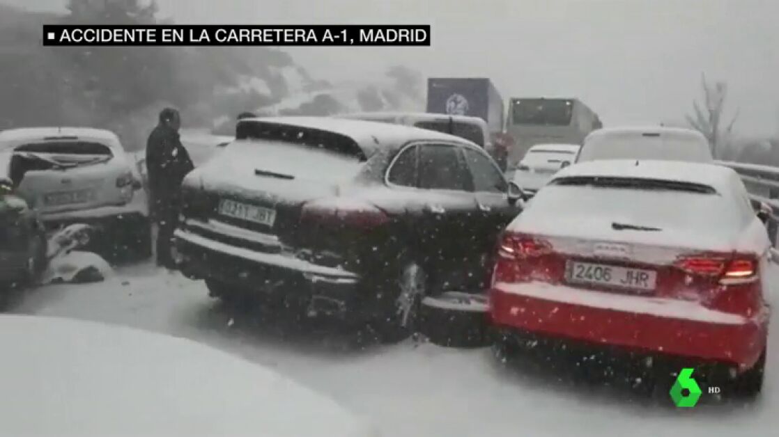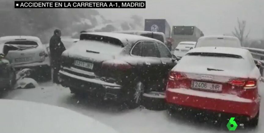 Un accidente múltiple en plena nevada en la A1 a la altura del puerto de Somosierra ha dejado 50 vehículos atrapados y 35 heridos, uno de ellos grave. Una mujer de 62 años ha tenido que ser trasladada al hospital en Segovia.