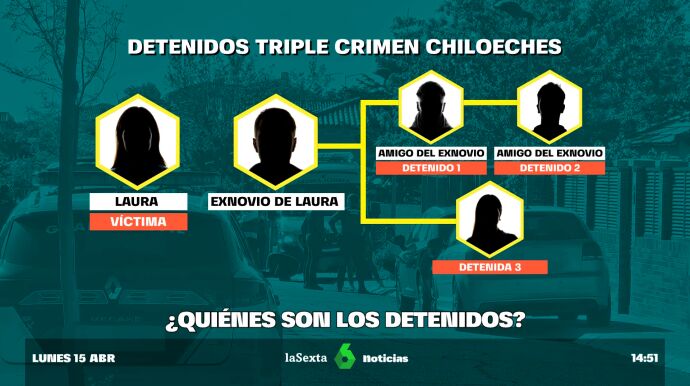 Los detenidos, dos hombres y una mujer, pertenecen al entorno cercano del ex novio de Laura. De hecho, uno de ellos es el primo del joven, mientras que la mujer habría sido arrestada por encubrimiento. Los tres fueron detenidos en la localidad de Pioz, ubicada en la provincia de Guadalajara y a pocos kilómetros de Chiloeches.