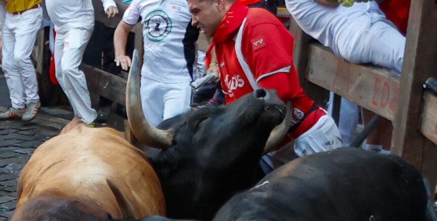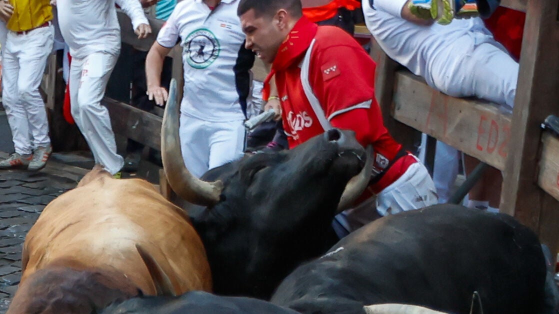 Así ha sido el séptimo encierro de San Fermín: tenso al arranque, con un toro retando y varios corneados