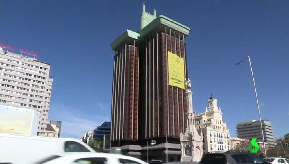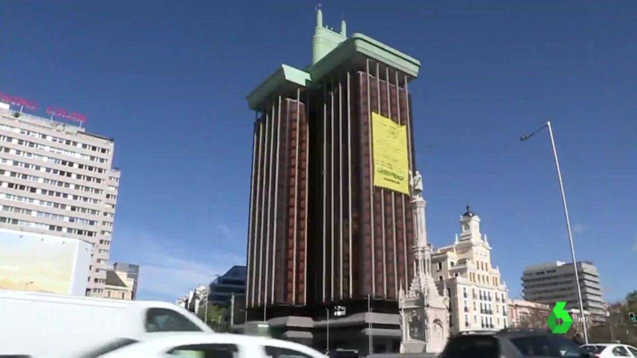 Un grupo de activistas de la organización ecologista Greenpeace ha desplegado en una de las populares Torres de Colón, en Madrid, una pancarta gigante para denunciar la "inacción" de los políticos y de las empresas en materia medioambiental.