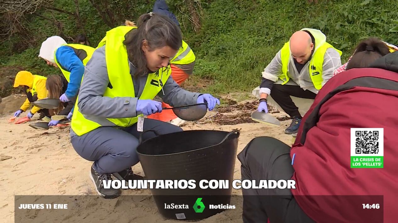 Un total de 50 voluntarios se encargan de peinar la playa de Ariño, en A Coruña. La mayoría son estudiantes. Es una tarea complicada, aseguran ellos mismos a las cámaras de laSexta. Varias empresas ya están facilitando a estos voluntarios varios kits de limpieza. El fundador de Vazva, Óscar Vales, relata que llevan coladores, bolsas, chalecos y tamices, entre otras cosas. Con la ayuda de escobas y cepillos, los voluntarios tiran de la vista de lince para dar con los pellets. "He cogido cinco en un ratito", expresa una estudiante. "Haces 100 gramos en una hora", añade otro chico.