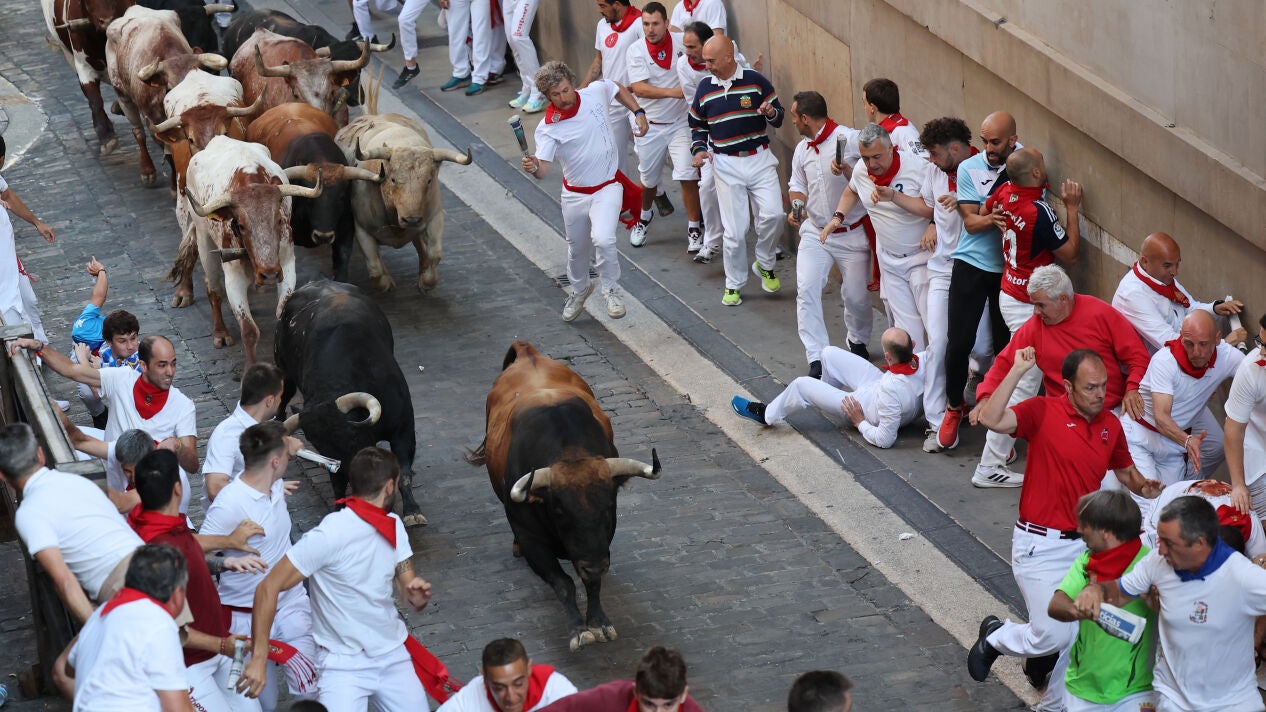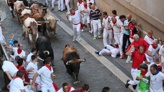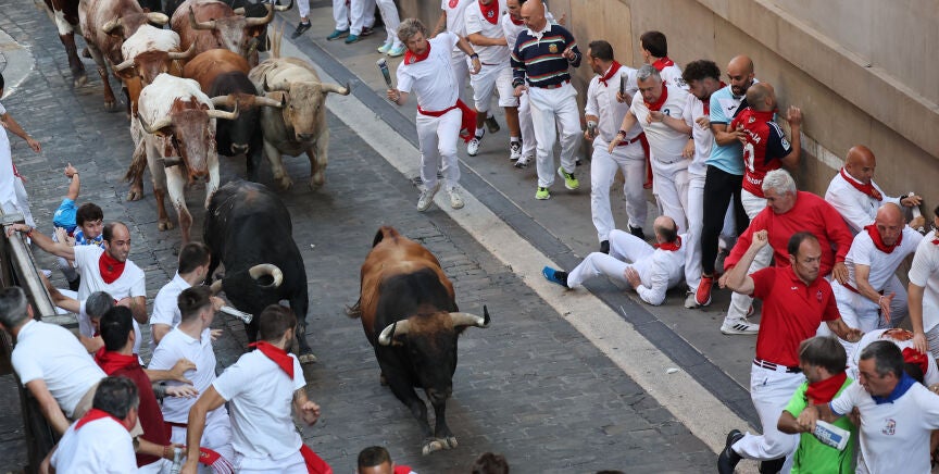 Haciendo honor a su fama, los astados de Fuente Ymbro han llegado a la curva de Mercaderes a gran velocidad sin permitir largas carreras de unos corredores incapaces de seguir su ritmo. La misma tónica se ha repetido a lo largo de toda la calle Estafeta donde se han vivido los mayores momentos de tensión, con dos corredores que, a escasos metros de distancia, han sido volteados por un toro castaño, y varios más a los que la manada les ha pasado por encima sin prestarles especial atención.