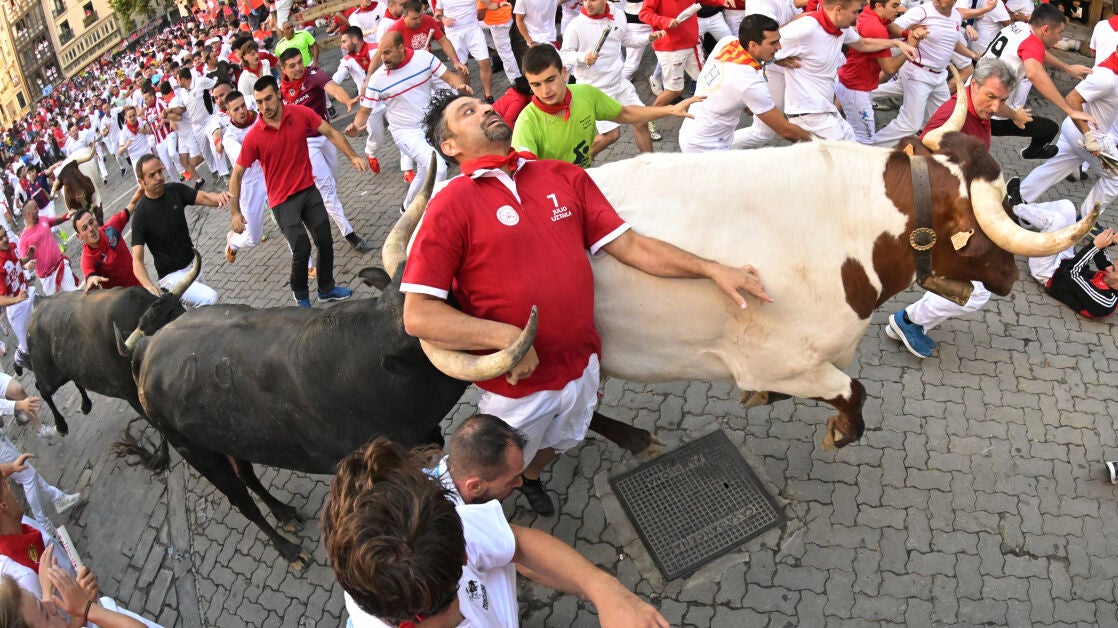 Los servicios sanitarios han informado de, al menos, un herido por asta de toro en este séptimo encierro de San Fermín, el penúltimo de las fiestas de 2023. El incidente ha tenido lugar en la bajada al callejón, después del tramo de Telefónica, cuando el primer animal de la manada ha alcanzado a un corredor. Durante la carrera se ha podido ver cómo el astado ha alcanzado a uno de los mozos, dándole la vuelta y manteniéndolo en el aire para voltearlo de nuevo. Eso sí, el corredor se ha levantado muy rápido y se ha retirado del encierro en un lateral de la calle.