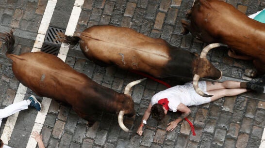 Cuesta arriba y haciendo forzar la carrera de los mozos, los bravos han completado este primer tramo con limpieza, excepto alguna caída, hasta llegar a la plaza Consistorial, donde uno de los astados ha barrido sin problemas su lado izquierdo. Ya en Mercaderes la manada, compacta, ha enfilado hasta la curva, que ha superado sin llegar a caer, un punto que ha servido para que ya encabezados por los cabestros comenzaran a estirarse y atravesar en esa disposición la larga calle de la Estafeta.