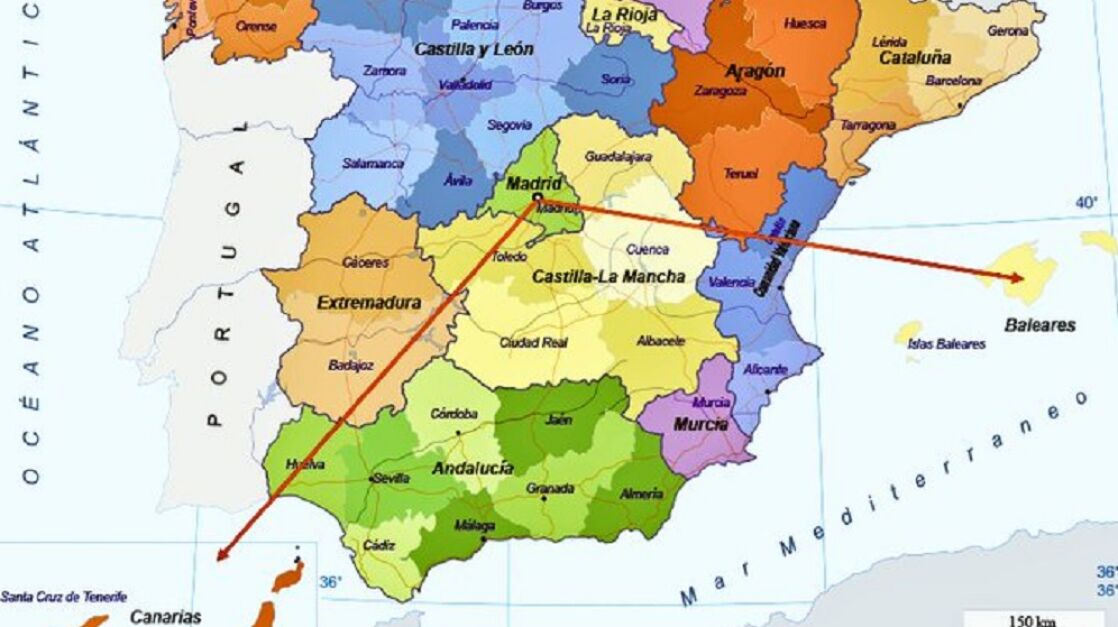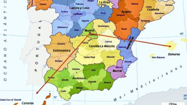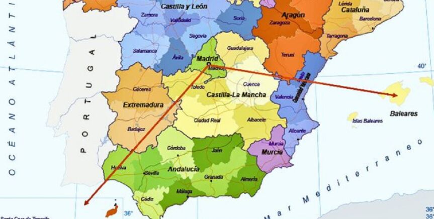 Esta vez ha sido el usuario de Twitter @TeLeoDelReves el que ha hablado sobre la localización de las Canarias, preguntándose por qué "un vuelo a Mallorca desde Madrid tarde 45 minutos y a Canarias dos horas si están a la misma distancia" y acompañando el mensaje de una imagen en la que aparece una línea recta de la misma medida desde Madrid a las Baleares y a Canarias.