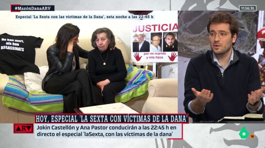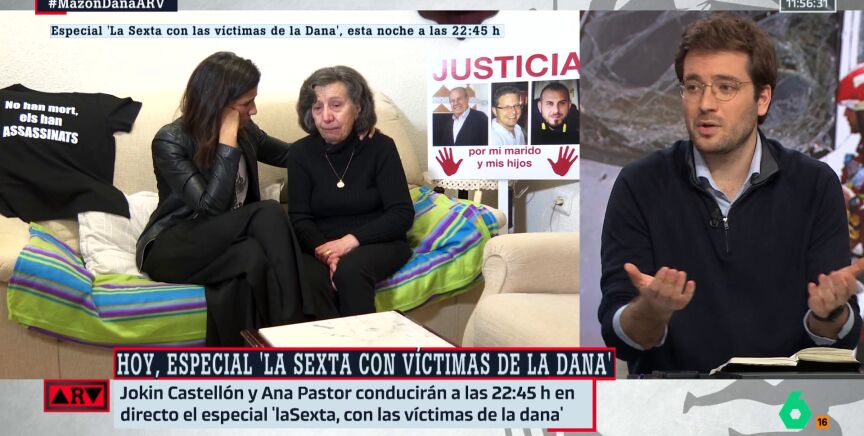 A partir de las 22:30h en laSexta, podremos escuchar el testimonio de algunas víctimas en un especial Conspiranoicos: 'laSexta, con las víctimas de la DANA', conducido por Jokin Castellón y Ana Pastor. El politólogo Alán Barroso reacciona en Al Rojo Vivo al duro relato de Dolores, una víctima que perdió en la tragedia de la DANA a su marido y a sus dos hijos: "Se me parte el corazón", confiesa.