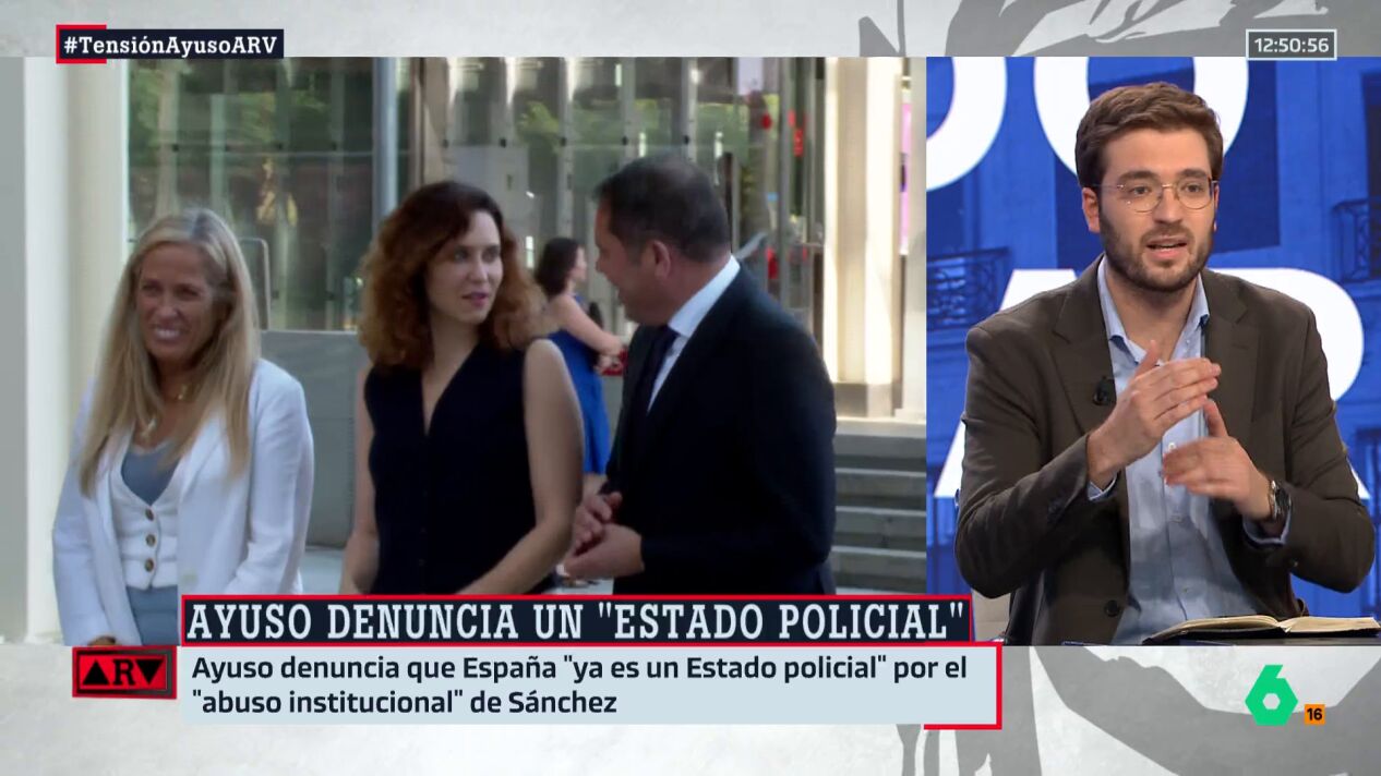 "Si dice que esto es un estado policial, igual, a su parecer, hemos mejorado un poquito", señala el politólogo en referencia a cómo antes la presidenta de la Comunidad de Madrid aseguraba que vivíamos en una dictadura de Pedro Sánchez.