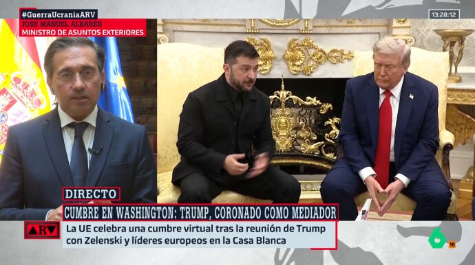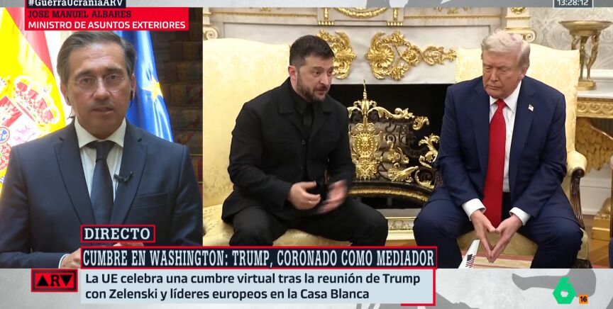 Tras la reunión entre Donald Trump y Volodímir Zelenski en la Casa Blanca, que este lunes albergó también un encuentro multilateral con varios líderes europeos y de la OTAN, la llamada 'Coalición de Voluntarios' ha mantenido una nueva reunión telemática este martes en la que, según traslada José Manuel Albares en Al Rojo Vivo, se ha puesto de relieve el apoyo a Ucrania"para defender su libertad y soberanía".