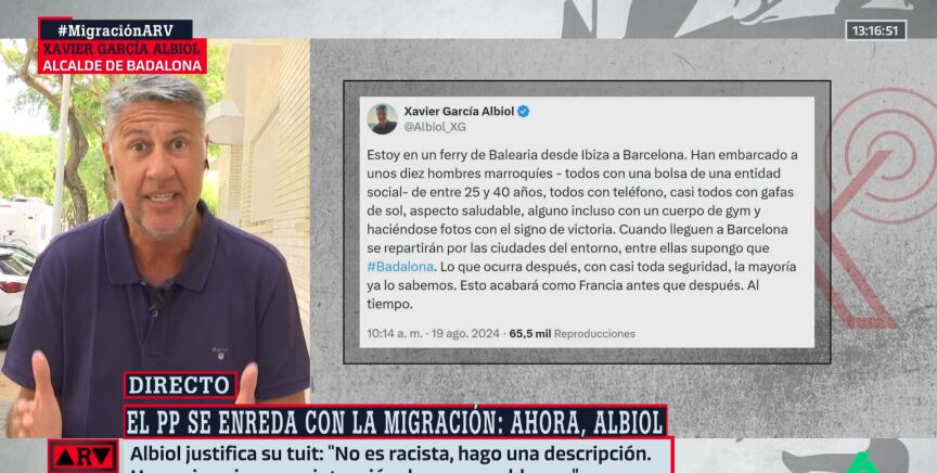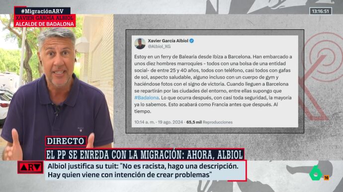 El alcalde de Badalona, el 'popular' Xavier García Albiol, ha vuelto a reafirmase en su tuit xenófobo, asegurando que no se arrepiente porque él "hizo una descripción de la parte de la migración ilegal". Así lo ha ratificado en una entrevista este martes en Al Rojo Vivo, pero donde ha matizado que él sí cree que "la mayoría tiene intención de integrarse, pero hay algunos que crean problemas".