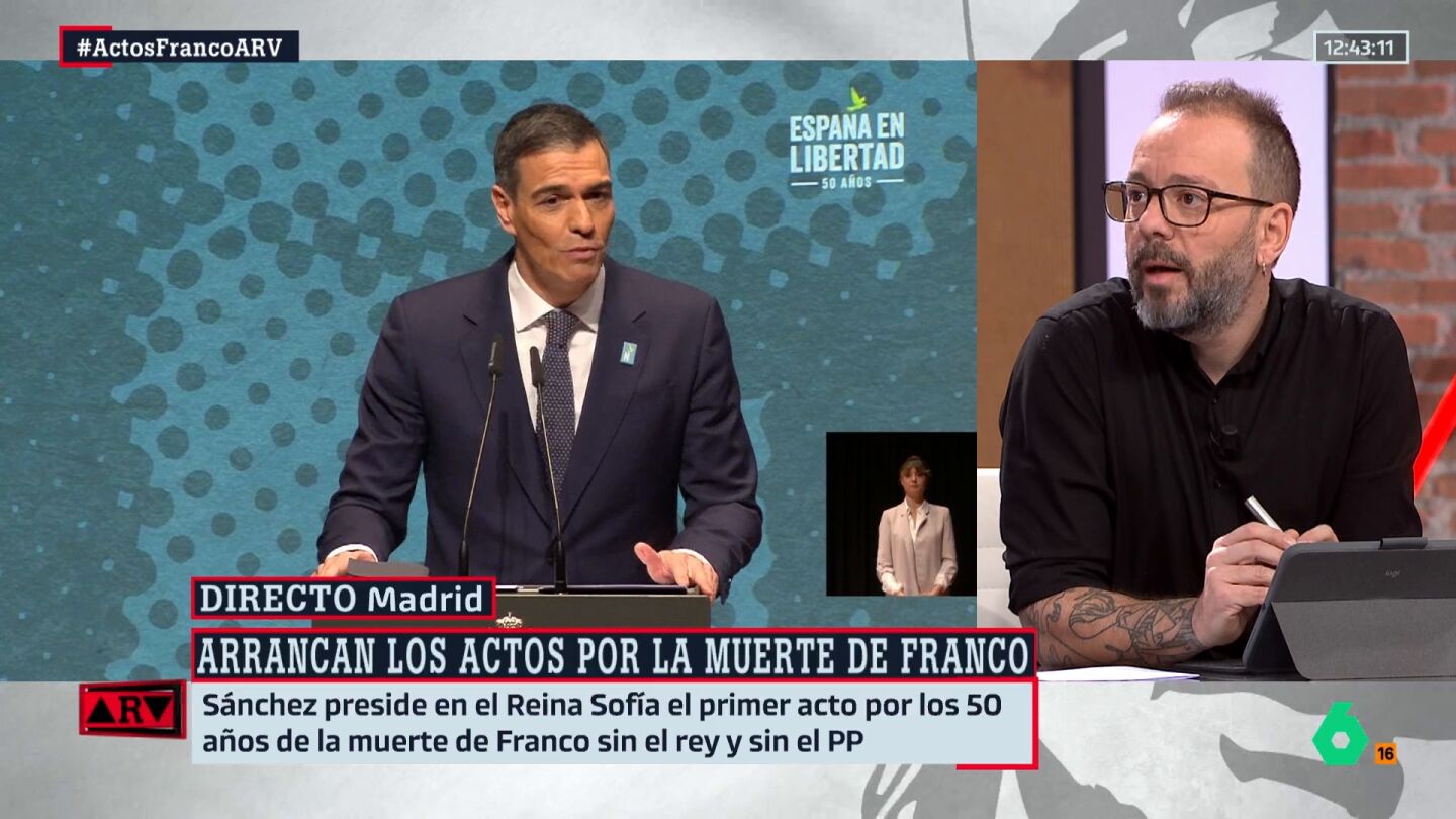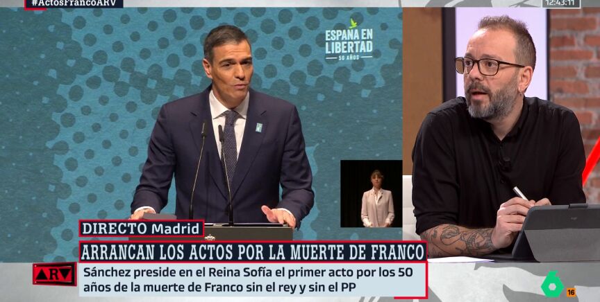 El presidente del Gobierno, Pedro Sánchez, ha iniciado en el Reina Sofia de Madrid, los actos para conmemorar el 50 aniversario de la muerte de Franco, no envuelto de polémica porque hay quienes no ven bien estos actos argumentado que no es el momento porque la democracia no empezó en 1975 con la muerte del dictador o que es tan solo un recurso de Sánchez para tapar otras cosas. Polémica a la que quiere contestar de forma contundente, en Al Rojo Vivo, el periodista y escritor, Antonio Maestre.