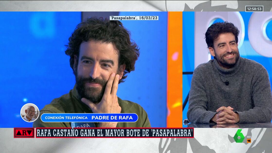 Uno de los momentos especiales que dejó el programa de este jueves de 'Pasapalabra' fue la llamada de Rafa Castaño a su padre tras ganar el bote de 'Pasapalabra'. "Papá, dos cosas. Una es que al final es que llego en el AVE de las 21:00 horas, y la segunda es que he ganado 2.270.000 euros", expresó el periodista sevillano, aunque no escuchó respuesta por parte de su padre, quien estaba en shock, por lo que le preguntó en tono de broma: "Papá, ¿te has muerto?".