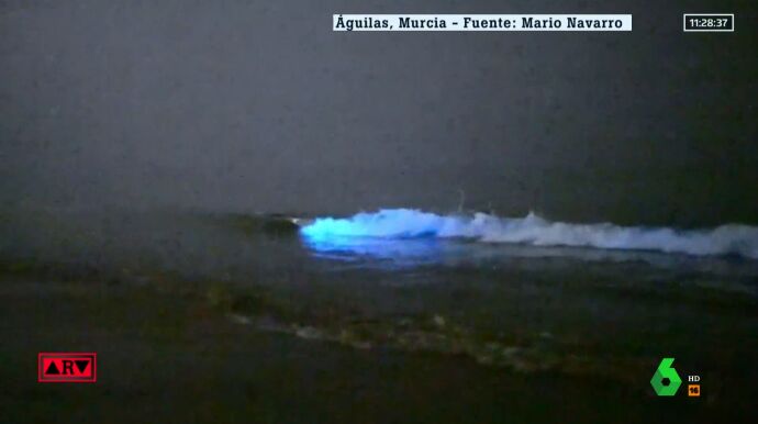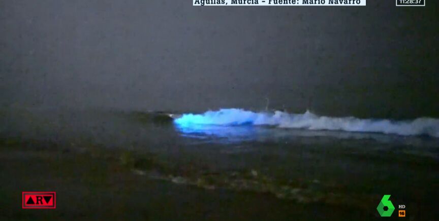 Bioluminiscencia. Es el espectacular fenómeno que deja imágenes mágicas del mar iluminado con un brillo azulado en plena noche. En España se ha producido en puntos de Galicia, según explica Francisco Cacho, y ahora se ha dado en la localidad murciana de Águilas, tal y como ha captado el fotógrafo Mario Navarro, que ha cedido a Al Rojo Vivo las increíbles imágenes del vídeo que ilustra estas líneas.