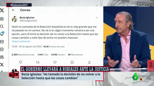 Iglesias fue llamado por Luis de la Fuente a mediados de marzo, aunque días después tanto él como David García quedaron fuera de la lista. Josep Pedrerol, desde el plató de Al Rojo Vivo, ha considerado que es "un gesto" pero no cree que otros futbolistas se vayan a sumar a él. "Los que van convocados no se van a mojar", ha sentenciado, antes de recordar que mientras Iglesias sí es habitual que muestre públicamente sus ideales, no lo es en el resto de jugadores.