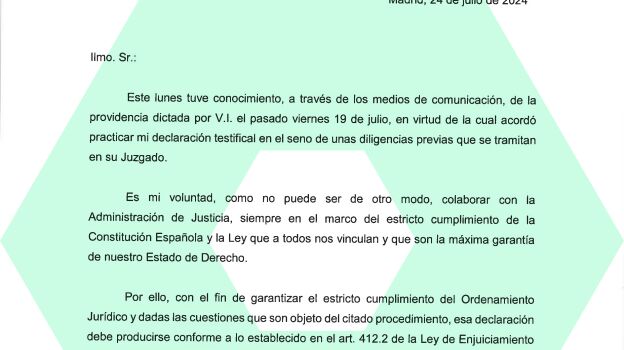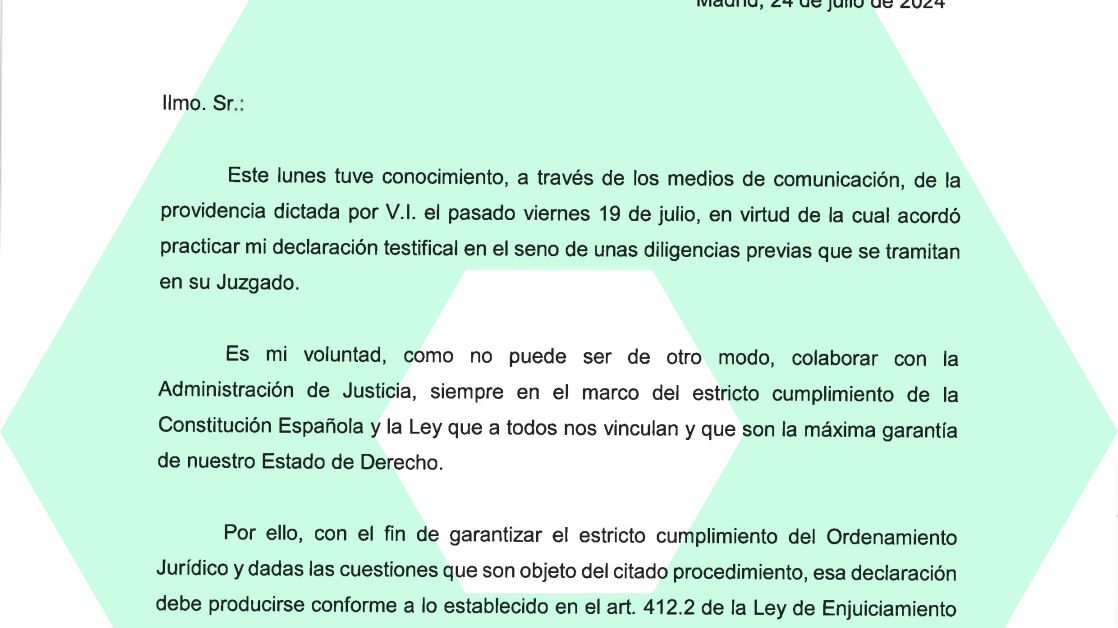 El presidente del Gobierno, Pedro Sánchez, ha dirigido un escrito al juez que investiga a su mujer, Begoña Gómez, solicitando que su declaración en calidad de testigo sea por escrito. Un documento breve, de apenas dos páginas y cinco párrafos y con fecha de este mismo miércoles, 24 de julio, cuyas claves desglosamos a continuación.