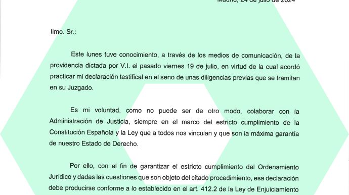 Es en el tercer párrafo del escrito en el que el presidente cita el artículo 412 de la Ley de Enjuiciamiento Criminal para solicitar declarar por escrito, ya que la norma prevé esta posibilidad para determinados cargos, entre ellos el presidente del Gobierno. Además, argumenta que su comparecencia se produce en calidad de presidente y no como esposo de Begoña Gómez, como sostiene el juez.