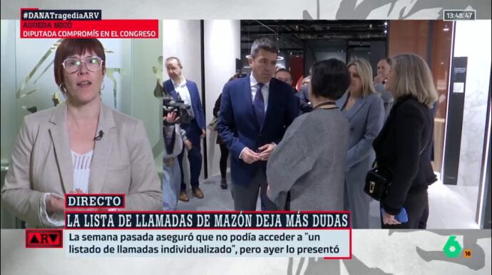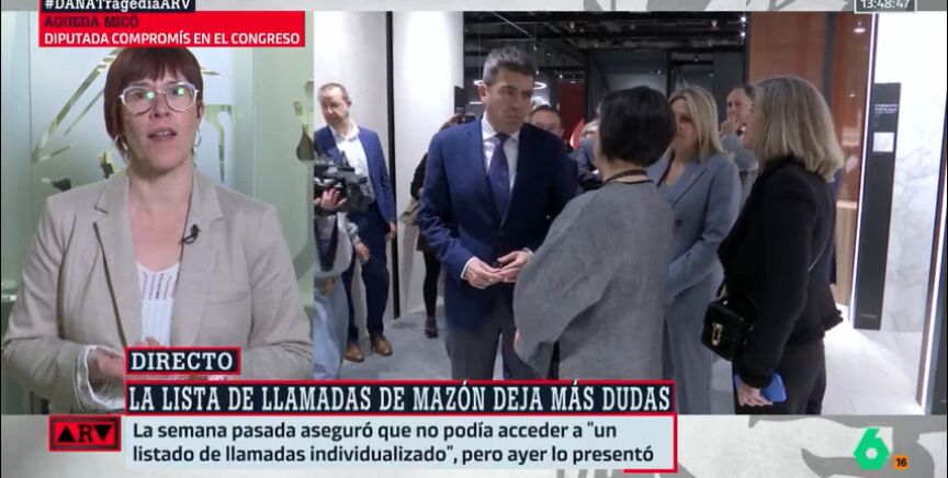 Desde Compromís lo tienen claro. "Carlos Mazón no tiene vergüenza". Así lo ha señalado este martes en Al Rojo Vivo su portavoz en el Congreso de los Diputados, Águeda Micó, quien además ha subrayado que el todavía president de la Generalitat Valenciana "empieza a tener miedo a los valencianos y a las valencianas". Unas palabras que llegan tras los sucesivos gritos de 'Mazón dimisión' que recibe en prácticamente todos los actos públicos, puesto que "la gente está muy enfadada".