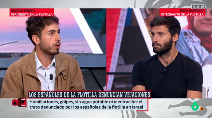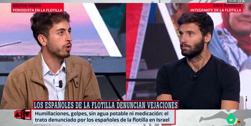 Los detalles Agresiones físicas, insultos, vejaciones y privación del sueño. El activista Rafael Borrego y el periodista Néstor Prieto relatan el calvario al que fueron sometidos durante su cautiverio en Israel tras la intercepción de la Flotilla.