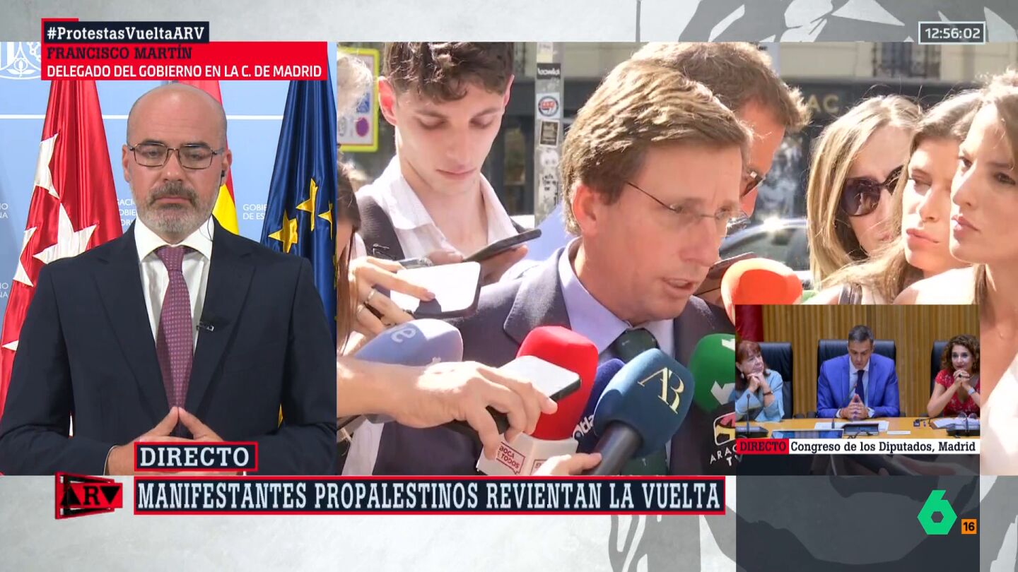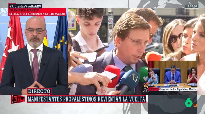 El delegado del Gobierno en la Comunidad de Madrid, Francisco Martín, ha respondido este lunes al alcalde de Madrid, José Luis Martínez-Almeida, respecto a las acusaciones que ha vertido contra el presidente del Gobierno, Pedro Sánchez, sobre quien, dice, alentó las protestas propalestinas que este domingo derivaron en la suspensión de la última etapa de La Vuelta.