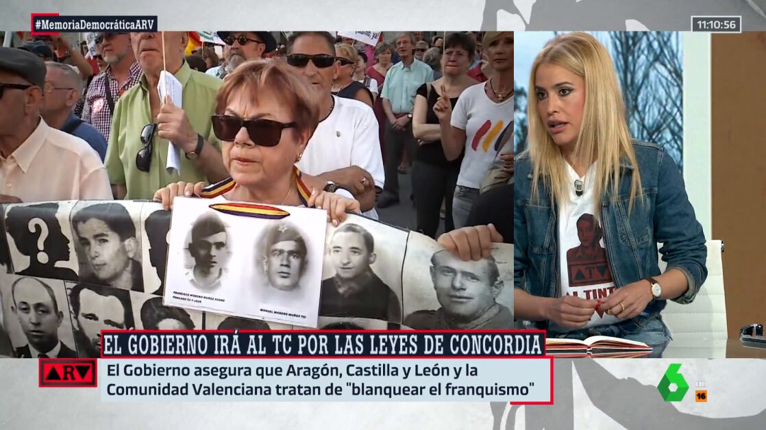 Su declaración e intervención no iba, en cambio, acorde con lo que representaba su camiseta ya que en la mesa se estaba tratando un tema bastante delicado y que levanta todavía muchas lágrimas en la población española en contra de las leyes llamadas de "concordia" de PP y Vox, en contra de la Memoria Democrática y que el Gobierno ha llevado al Constitucional.