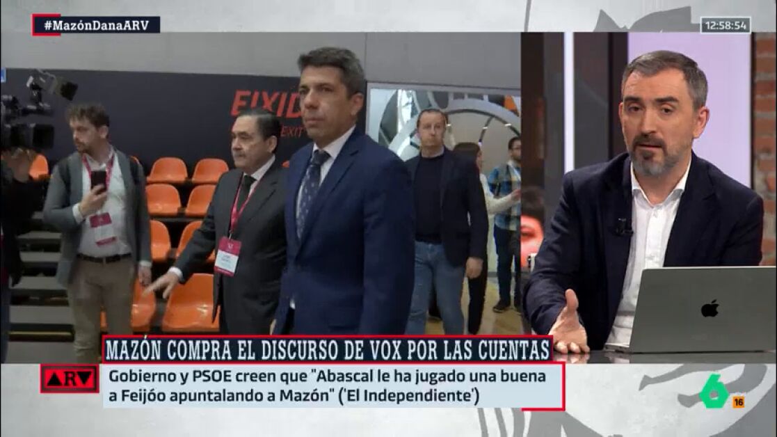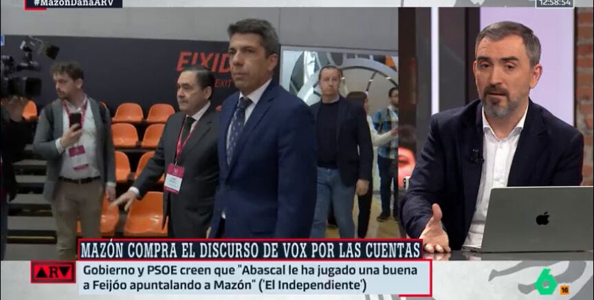 Ignacio Escolar, director y fundador de eldiario.es, habla en Al Rojo Vivo sobre el pacto de Mazón con Vox: "De Mazón no espero nada, porque después de ver cómo ha gestionado estos últimos meses, desde lo que ocurrió en la tarde del Ventorro hasta sus mentiras posteriores, está claro que está haciendo todo lo posible para aguantar hasta el final de la legislatura y así poder cobrar esa pensión que recibiría durante 15 años".