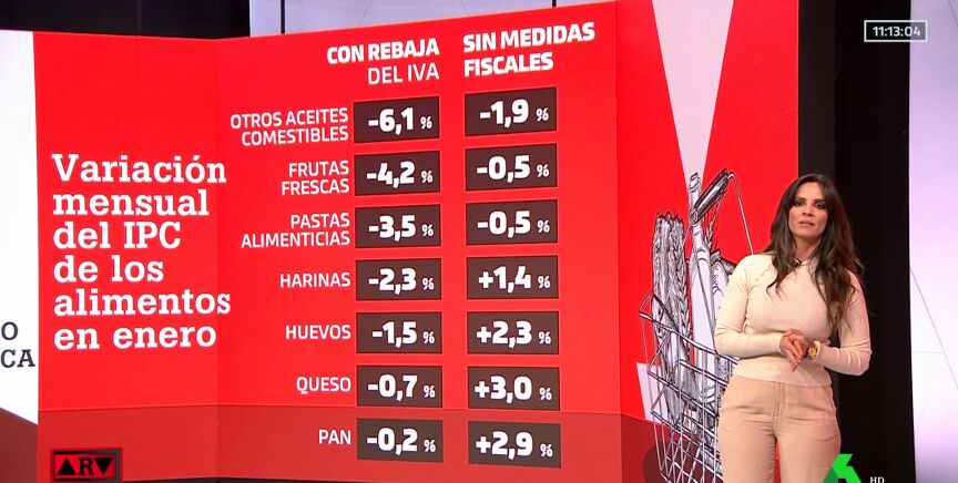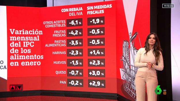 Por ejemplo, los aceites bajaron un 6,1%, mientras que sin la rebaja fiscal habrían bajado un 1,9%. Las pastas alimenticias cuestan un 3,5% cuando podrían haber bajado solo un 0,5% sin esa rebaja fiscal. Puedes consultar la lista completa en el vídeo principal de esta noticia.