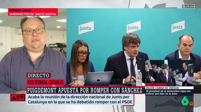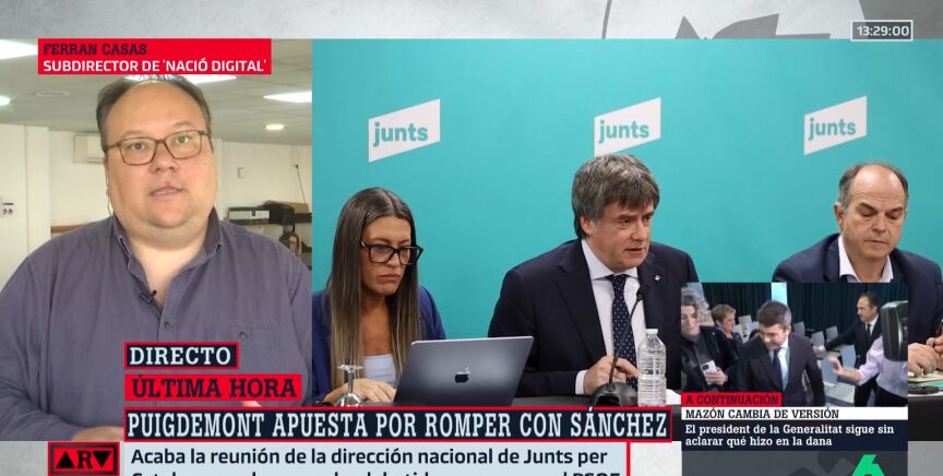 Ferran Casas, subdirector de 'Nació Digital', ha hablado en Al Rojo Vivo sobre las posibles consecuencias de la reunión de este lunes de la cúpula de Junts, y considera que, tras ella, "van a cambiar pocas cosas en el día a día a corto plazo", ya que, hasta el momento, "los votos de Junts ya no se daban por hecho en ninguna ley", tras lo que ha puesto el ejemplo de la reducción de la jornada laboral.