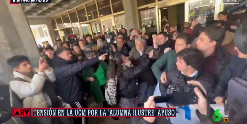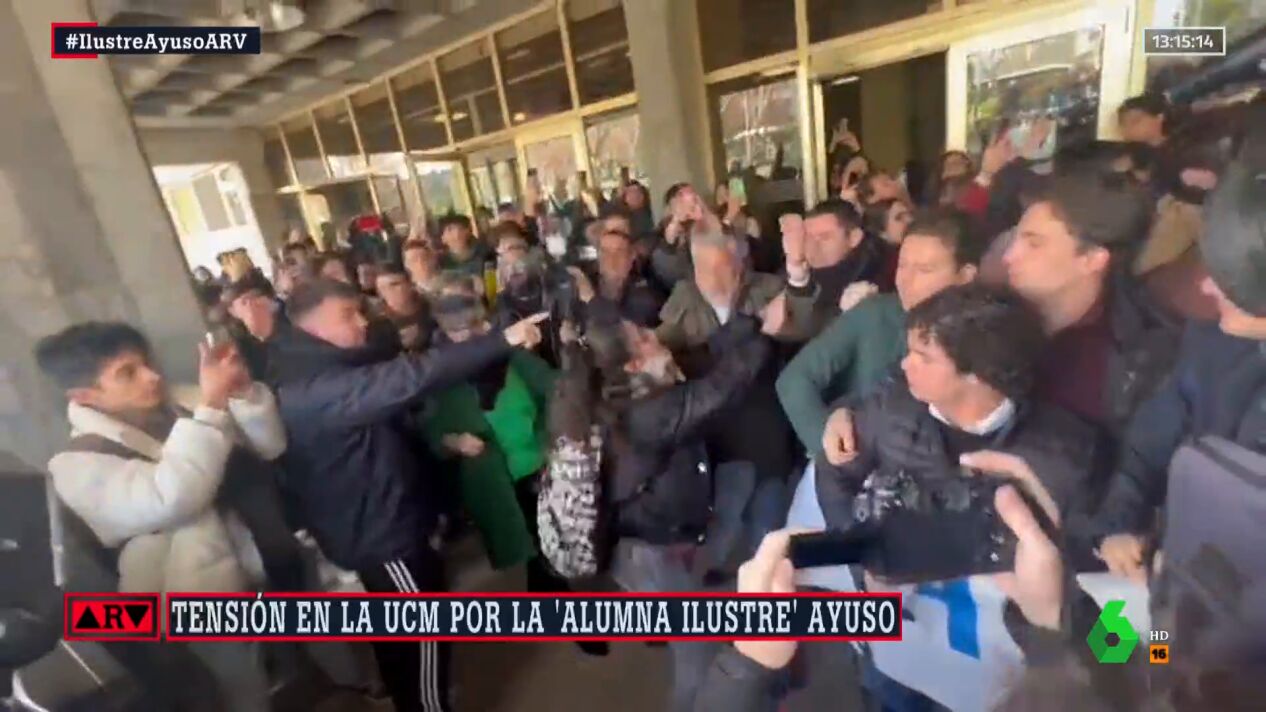 Seguidores y detractores de la presidenta de la Comunidad de Madrid se han enfrentado justo antes del acto por el que la Complutense, centro donde estudió Ayuso, va a reconocerla: "¡Fuera comunistas de la Universidad!", han exclamado algunos.