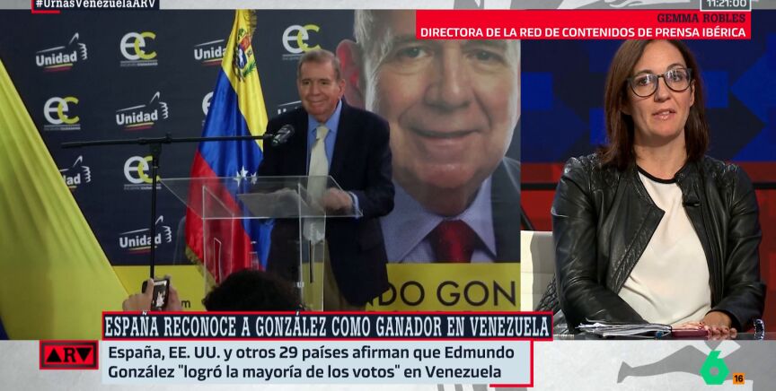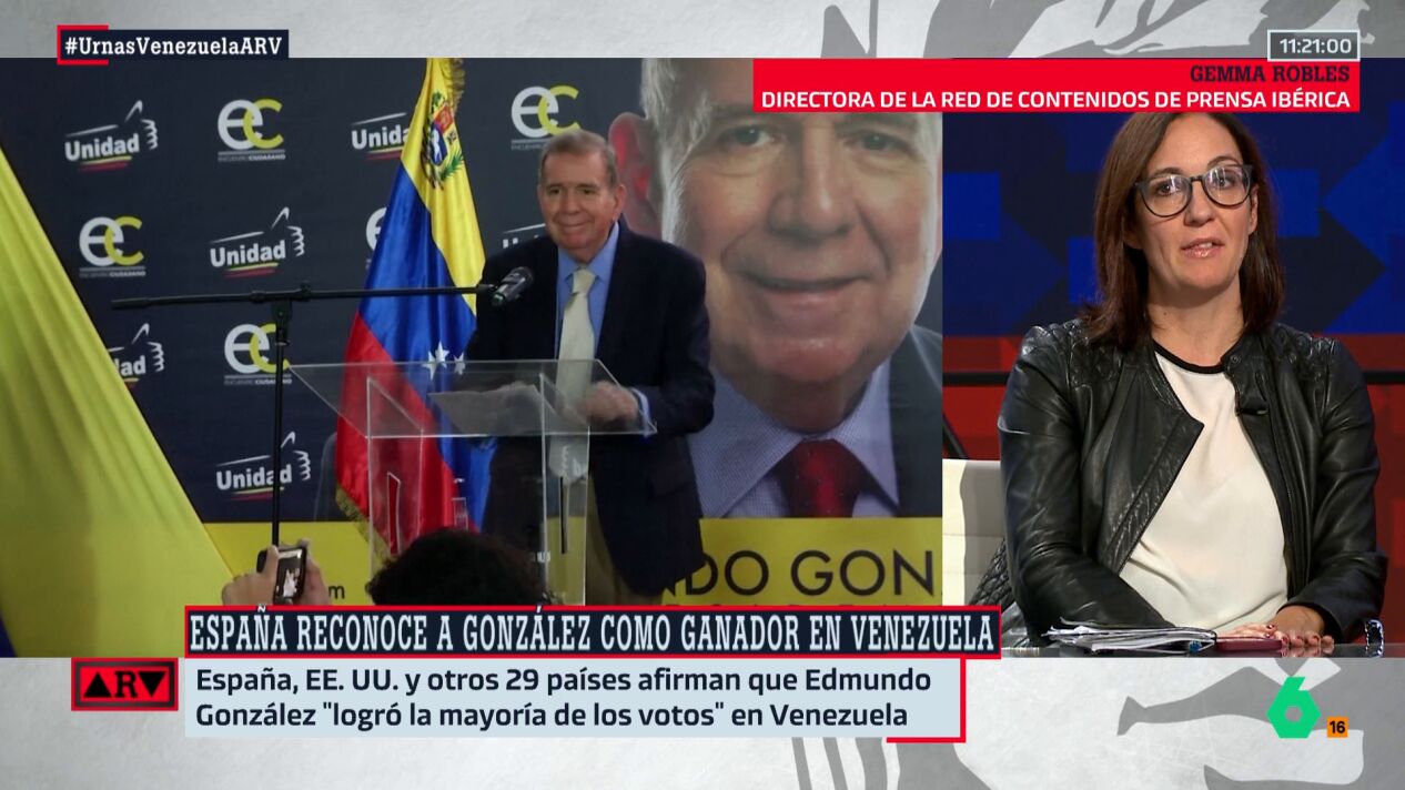 Gemma Robles, directora de la red de contenidos 'Prensa Ibérica' analiza la declaración que ha firmado España, junto con otros países como EEUU y Argentina en la cual reconoce que Edmundo González es el que obtuvo más votos en las elecciones de Venezuela. España y otros 29 países firman un documento en el que aseguran que González "logró la mayoría de los votos en Venezuela".