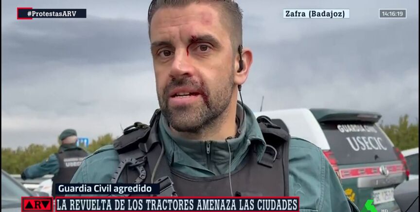 Un guardia civil ha resultado herido esta mañana en las protestas de los agricultores en Zafra. Las cargas policiales intentaban evitar el corte de la autovía A-66 cuando un agente ha resultado herido por una pedrada.