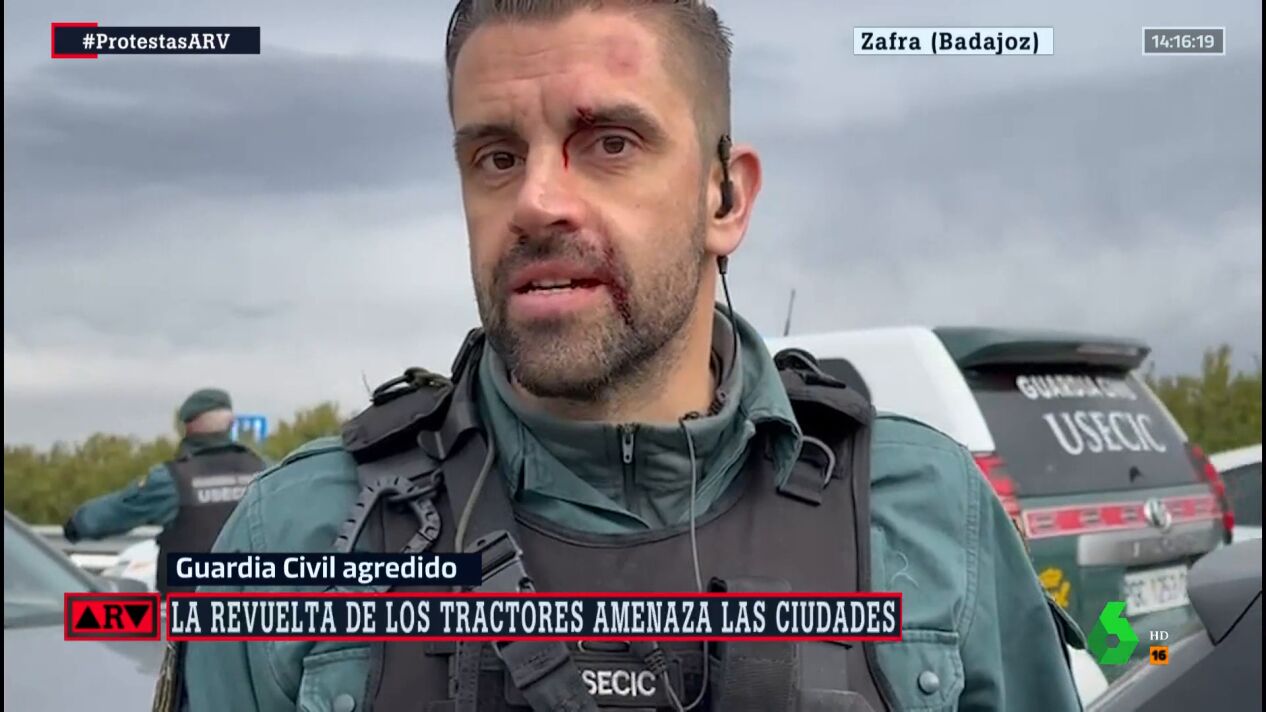 Un agente de la Guardia Civil ha resultado herido de una pedrada durante las protestas de agricultores en el sur de Extremadura, concretamente durante la cargas contra manifestantes para evitar el corte del tráfico en la autovía A-66, a la altura de Zafra.