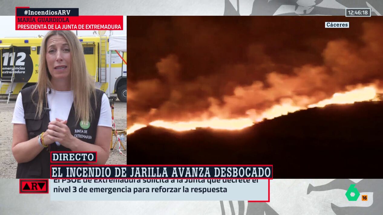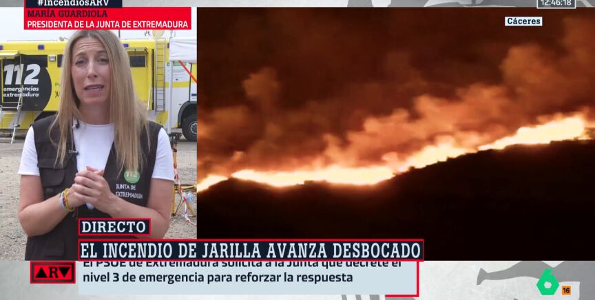La presidenta de la Junta de Extremadura, María Guardiola, ha acusado al PSOE de Extremadura de estar "intentado buscar una oportunidad política para sacar rédito de una tragedia". Una denuncia que ha hecho este lunes en Al Rojo Vivo a raíz de una publicación en sus redes sociales en la que denunciaban que la baronesa 'popular' había mentido en sus declaraciones respecto a la falta de respuesta del Gobierno central para hacer frente al incendio de Jarilla (Cáceres), en el que también instaban a pedir la declaración del Nivel 3 de Emergencia.