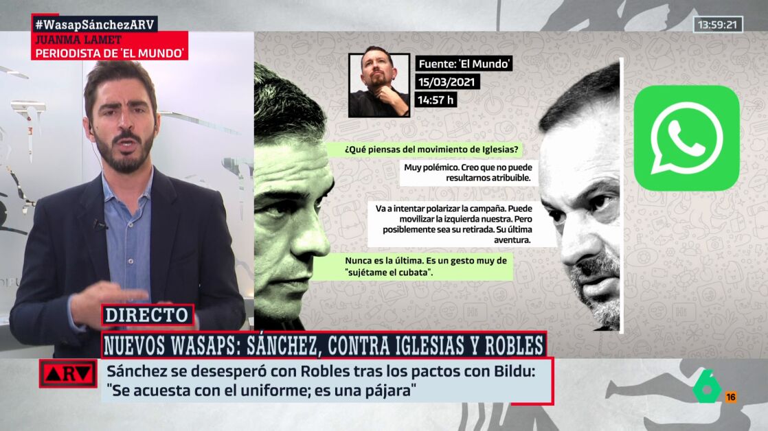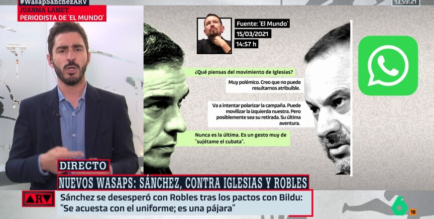 En Al Rojo Vivo, el periodista ha adelantado detalles sobre los mensajes en poder de El Mundo y ha defendido que "son asuntos relevantes que, en el ejercicio de nuestra labor de servicio público, debemos contar y contextualizar, sin invadir la esfera privada".