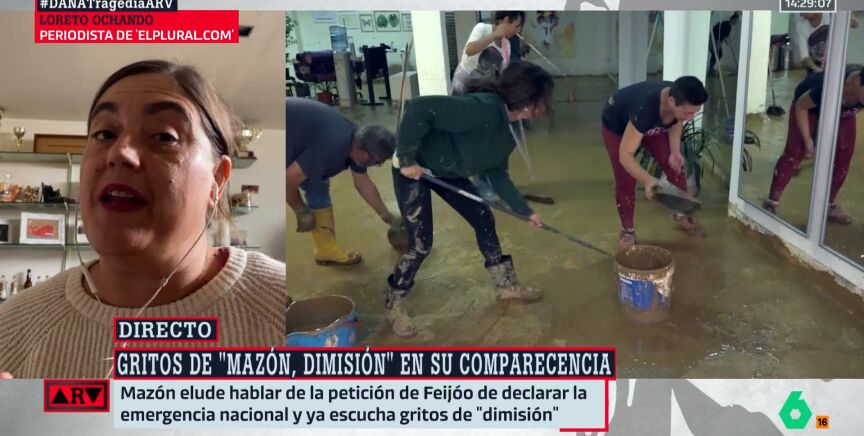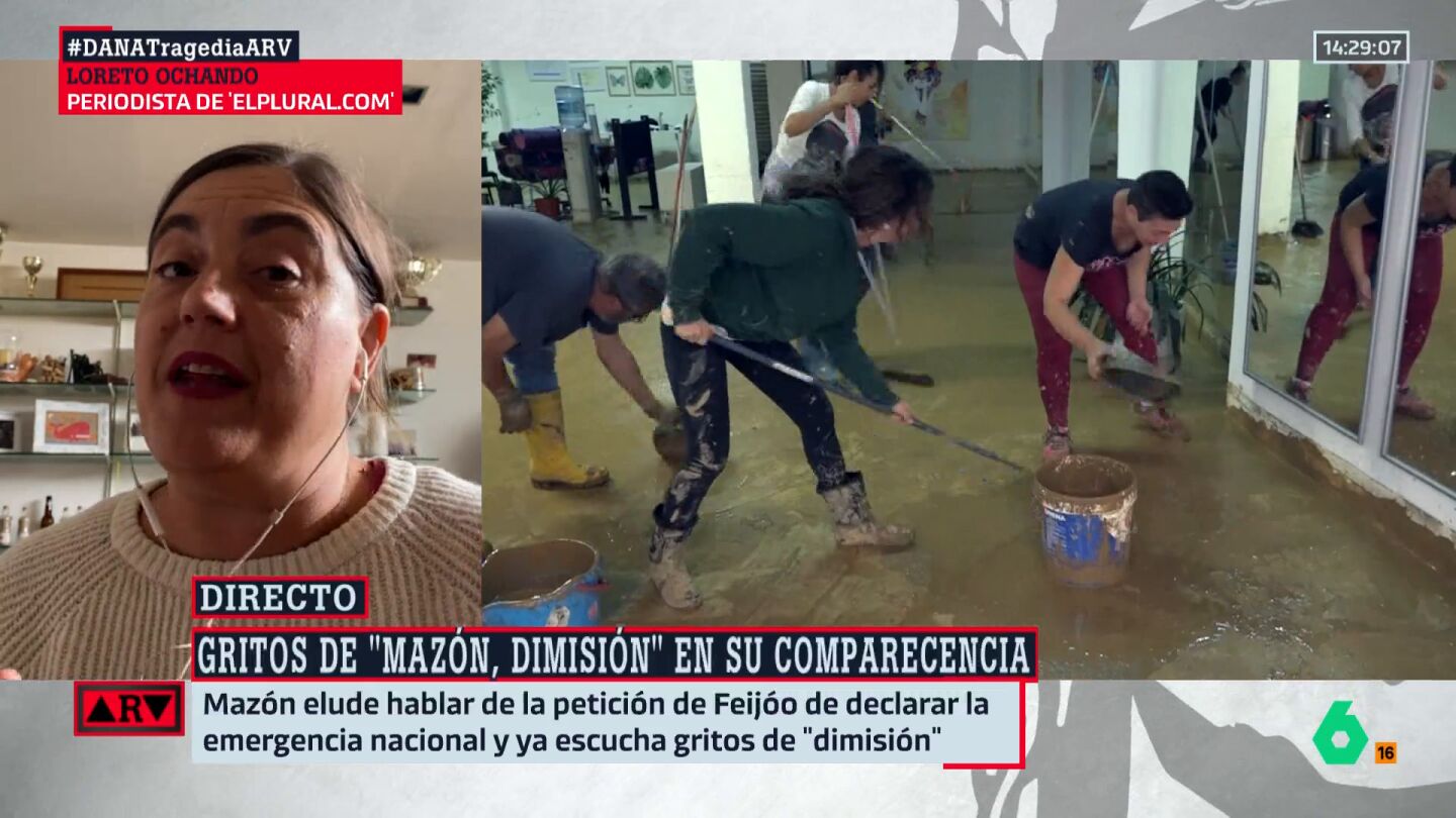 La periodista valenciana Loreto Ochando, de El Plural, estuvo presente en la comparecencia que dio ayer Carlos Mazón, presidente de la Comunidad valenciana, en el Palau de la Generalitat, cuando, desde la calle, le gritaban: ¡Mazón, dimisión! por su gestión ante la DANA.