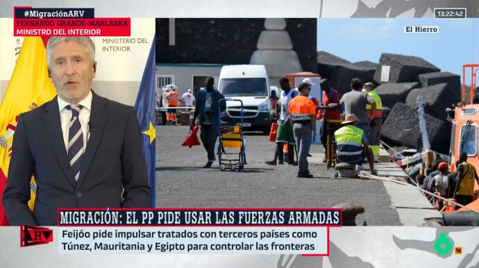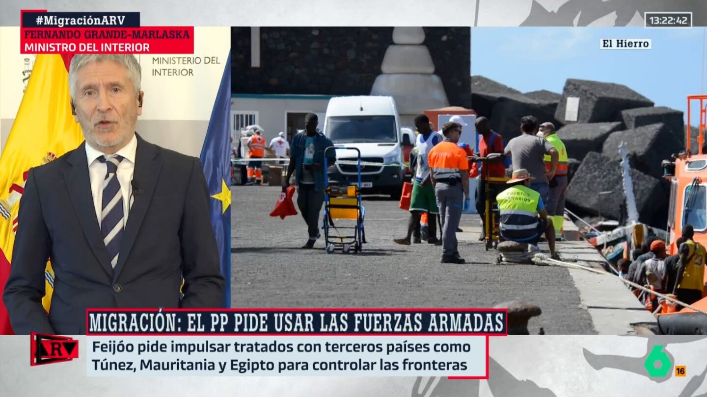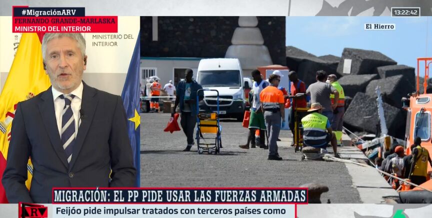 Fernando Grande-Marlaska ha acusado al Partido Popular de tener un "desconocimiento palmario" sobre lo que es la realidad migratoria y cómo hacerle frente. El ministro del Interior ha reconocido que no le ha llamado la atención ver que Miguel Tellado ha pedido al Gobierno que despliegue a las Fuerzas Armadas después de las declaraciones que ha realizado en los últimos días Alberto Núñez Feijóo sobre este asunto.