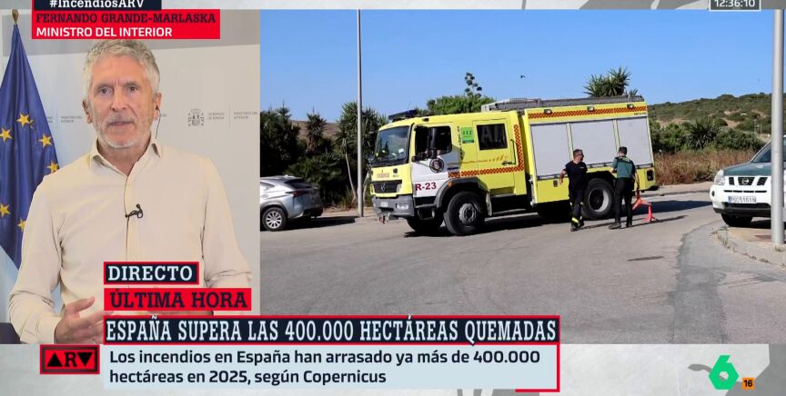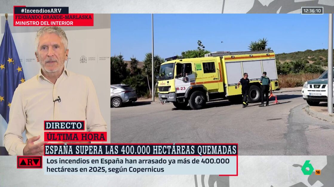 "En lo que respecta al Gobierno de España, ha puesto a disposición de quienes son los competentes en la gestión de la emergencia, las comunidades autónomas, todos los medios que nos han solicitado desde el minuto uno". Así lo defiende el ministro del Interior, Fernando Grande-Marlaska, en Al Rojo Vivo, donde además sostiene que en el Ejecutivo han sido "proactivos" al acudir a la Unión Europea para disponer también de los medios de otros Estados miembros para hacer frente a la actual ola de incendios.