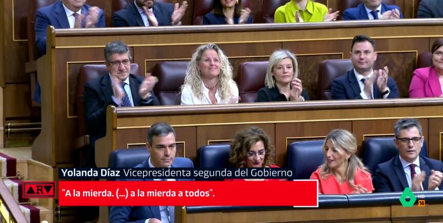 Cuando este miércoles el jefe del Ejecutivo concluía su primera réplica al líder de la oposición, Alberto Núñez Feijóo, diciéndole "ni mil paladas de fango van a tapar los Gobiernos de la vergüenza que tienen ustedes con Vox y lo que pretenden exportar a Europa", ha parecido escucharse a Díaz decir "a la mierda" y, acto seguido, señalar "a la mierda todos", mirando a Sánchez y entre risas.