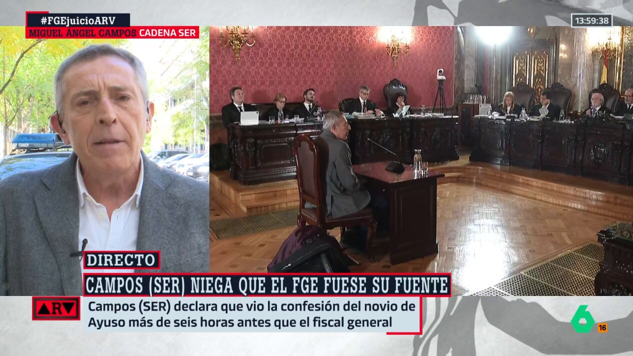 Tras testificar en la cuarta jornada del juicio al fiscal general del Estado, el periodista de la Cadena SER, Miguel Ángel Campos, habló en Al Rojo Vivo sobre su comparecencia y explicó el proceso por el que fue llamado a declarar: cómo accedió al correo con la confesión de Alberto González Amador y los pasos que siguió hasta informar sobre ello.