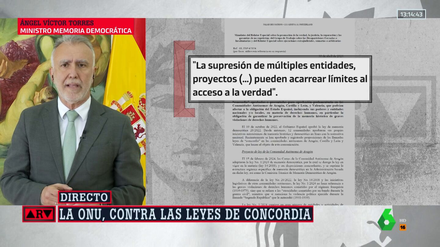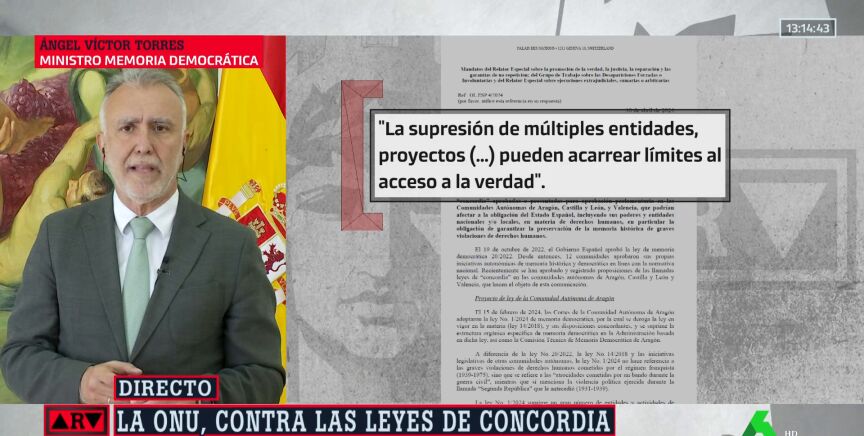 Durante su entrevista en Al Rojo Vivo, Torres ha destacado que la ONU ha leído la ley completa y ha llegado a la conclusión de que no se puede aprobar que "no condene el franquismo". "Lo que tienen que hacer estos gobiernos es modificar sus propuestas", ha asegurado.