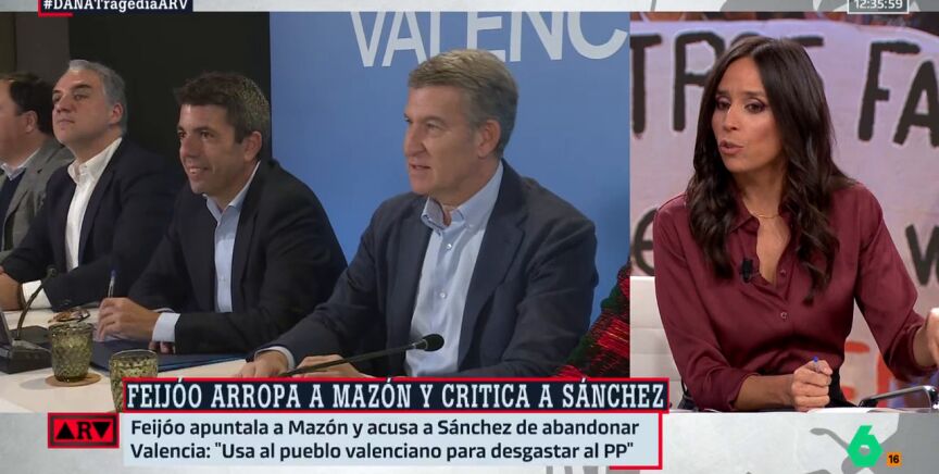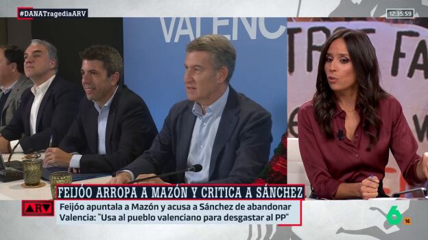 "En octubre, Feijóo le desautorizó e instó a que cediera las competencias al Gobierno central y ahora le apoya diciendo unas palabras muy desafortunadas. Ha dicho que está 'muy orgulloso de su gestión', cuando la gestión de Mazón es absolutamente negligente, antes, durante y después de la DANA", afirma la periodista.