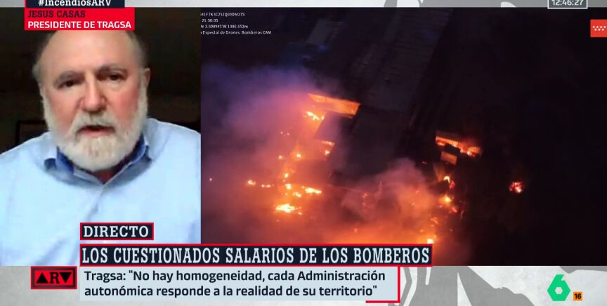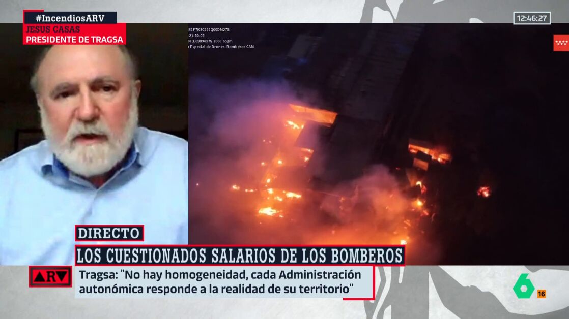 En Al Rojo Vivo, el presidente de Tragsa, Jesús Casas, ha hablado sobre los incendios y las condiciones salariales de los bomberos. Ante la pregunta de si le parecía normal que un bombero de la Comunidad de Madrid cobre de media 1.300 euros, ha respondido: "No sé si gana 1.300 euros; lo que se ha difundido es una nómina de un peón fuera del proceso de extinción".