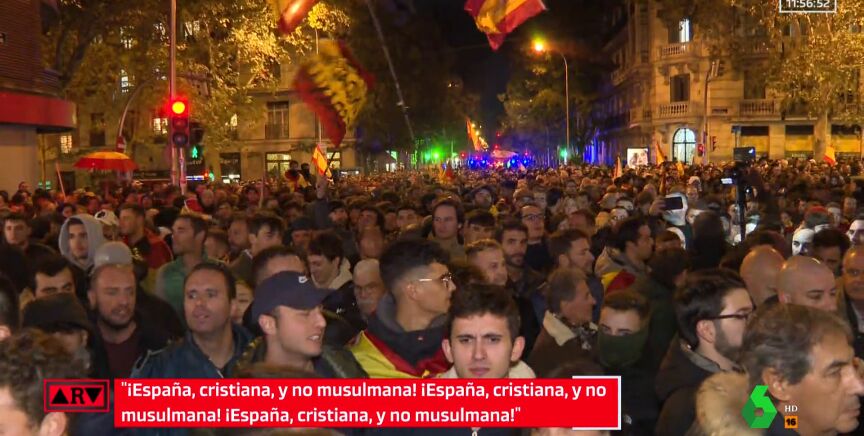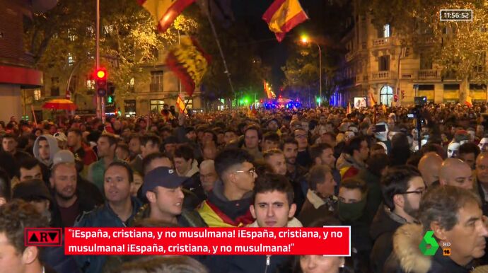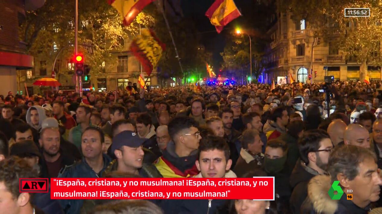 "La Constitución destruye tu nación" o "España es cristiana y no musulmana". Estos son algunas de las frases que se pudieron escuchar durante la manifestación ultra que tuvo lugar frente a la sede del PSOE en Ferraz.