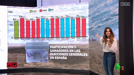 De todas las que se han celebrado hasta la fecha, la participación nunca ha sido inferior al 65%. De hecho, las elecciones generales en las que menos personas han ido a votar han sido en las de 2019, con un 66,2%, ganando el PSOE.