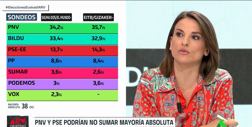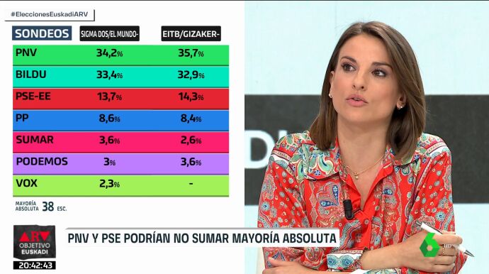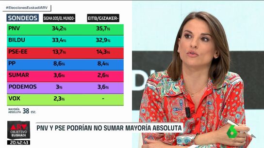 En este sentido, el diputado del PP Manuel Cobo ha señalado que "en las anteriores elecciones, el PP fue en coalición con Ciudadanos", pero que "ya no existe Cs", por lo que, según ha dicho, ahora pueden sacar "siete, y desapareciendo también Vox". Tras esto, Ignacio Escolar ha expresado que hay que ver "si se mantiene la mayoría de Gobierno, si va a ser necesario el concurso de más partidos, o va a ser como hasta ahora, el PNV y el PSE".