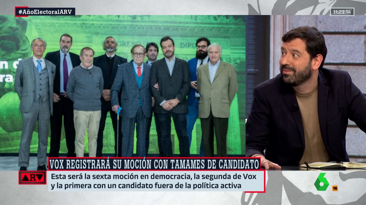 El corresponsal político de Infolibre, Arturo Ruiz Valdivia, ha criticado la imagen con la que Vox anunció la segunda moción de censura al Gobierno de Pedro Sánchez, con el veterano economista Ramón Tamames como candidato.