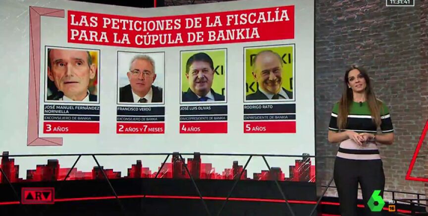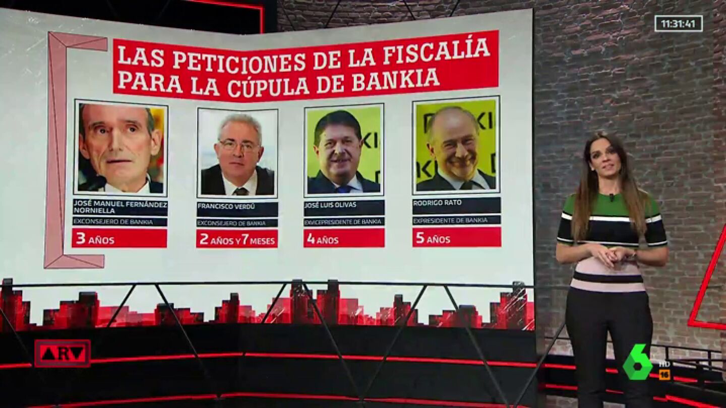 La Fiscalía y la abogacía del Estado acusan a cuatro de ellos, a la entonces cúpula de la entidad: los exconsejeros José Manuel Fernández Norniella y Francisco Verdú, el exvicepresidente José Luis Olivas y el expresidente Rodrigo Rato, para el que piden la mayor pena, cinco años de cárcel.