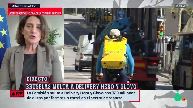 La vicepresidenta primera y comisaria de Competencia de la Comisión Europea, Teresa Ribera, no ha dudado este lunes en sacar pecho de la multa de 329 millones de euros a las compañías Glovo y Delivery Hero, ahora fusionadas, por formar un cártel de reparto a domicilio. Lo ha hecho en una conexión en Al Rojo Vivo donde también ha celebrado que la medida "también es positiva para los trabajadores".