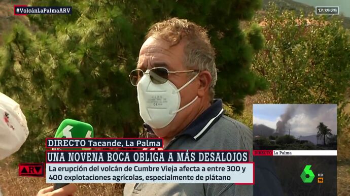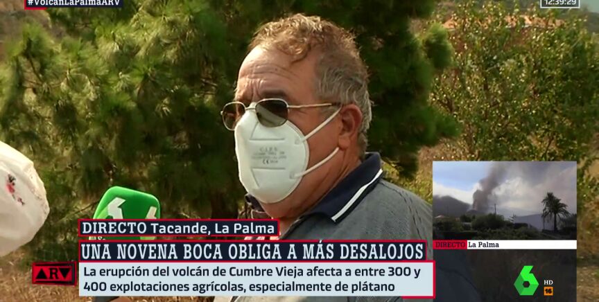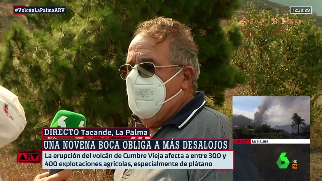 Ante las cámaras de laSexta explica que "tengo que arriesgarme para intentar salvar algo". Y es que una de las coladas de lava del volcán de La Palma, que ya ha arrasado más de 100 hectáreas y al menos 166 viviendas, está muy cerca de su terreno.