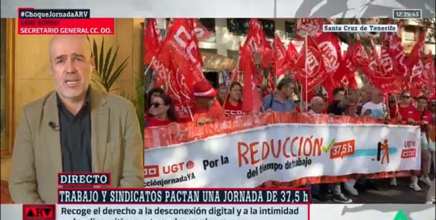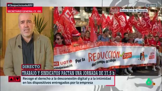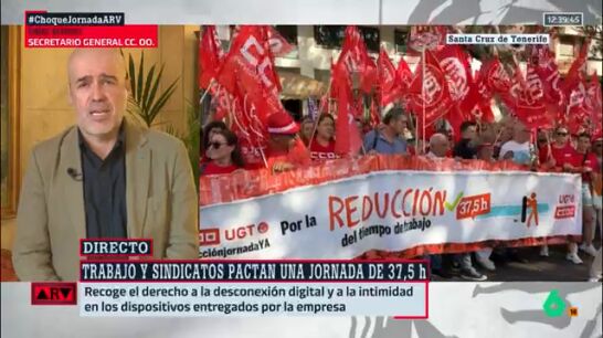 El secretario general de CCOO, Unai Sordo, conecta con Al Rojo Vivo para hablar sobre el acuerdo al que ha firmado su sindicato con UGT y el Ministerio de Trabajo sobre la reducción de la jornada laboral, que pasará de ser de 40 horas a 37,5. "Llevamos casi un año trabajando en él, pero no ha sido posible incorporar finalmente a las organizaciones empresariales", indica en esta conexión, en la que defiende que el texto del acuerdo al que han llegado es "muy completo".